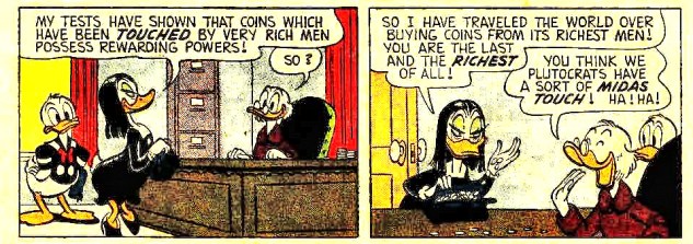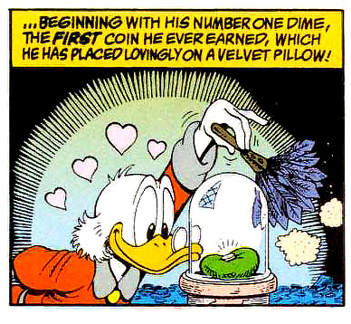 Joachim Kalka’s 2009 New Left Review article on the waning presence of tangible coinage in credit card capitalism is a delightful read. Kalka enlists Scrooge McDuck to illustrate a monetary carnality opposed to the fluid meaninglessness of the exchange principle. In Scrooge’s Duckburg vault, money isn’t just something you get to get something else (and that “something else,” once given a monetary value, is itself imperiled by this reduction to mere abstract quantity). For Scrooge, money feels deliciously good and offers an exhilirating physical encounter in which he revels. In his direct encounter with his money Scrooge finds life.