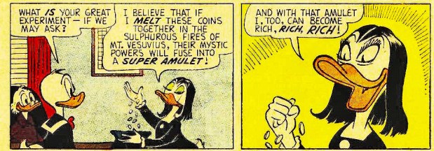 After his launch in 1947 Scrooge’s life was a round of such enjoyments and escapades. Scrooge’s fending off of challenges and demands on his money pile seems to flow inevitably from the distribution of wealth and scarcity. But the humorous banality of these plots undergoes an abrupt turn with the introduction of Magica de Spel in December 1961, fourteen years after Scrooge first swam in his money pool. Magica, a sorceress, is unlike Duckburg’s other characters in that she also invests Scrooge’s money with transcending significance. Her interest is exclusively oriented to the first dime Scrooge earned, over which he dotes: