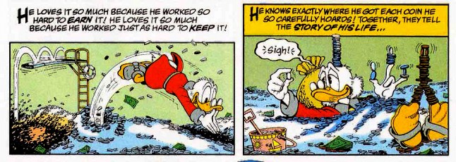 There are more ways of navigating the envy of others. Already in the first issue Scrooge advises his nephew that he should emulate Scrooge himself to solve his financial problems. It is not just that Donald should save more, but that he should join Scrooge in his perverse devaluation of “silly pleasures”: