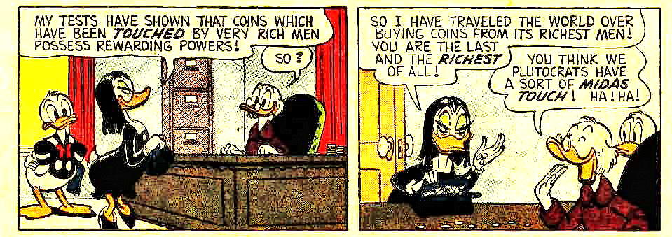 After his launch in 1947 Scrooge’s life was a round of such enjoyments and escapades. Scrooge’s fending off of challenges and demands on his money pile seems to flow inevitably from the distribution of wealth and scarcity. But the humorous banality of these plots undergoes an abrupt turn with the introduction of Magica de Spel in December 1961, fourteen years after Scrooge first swam in his money pool. Magica, a sorceress, is unlike Duckburg’s other characters in that she also invests Scrooge’s money with transcending significance. Her interest is exclusively oriented to the first dime Scrooge earned, over which he dotes: