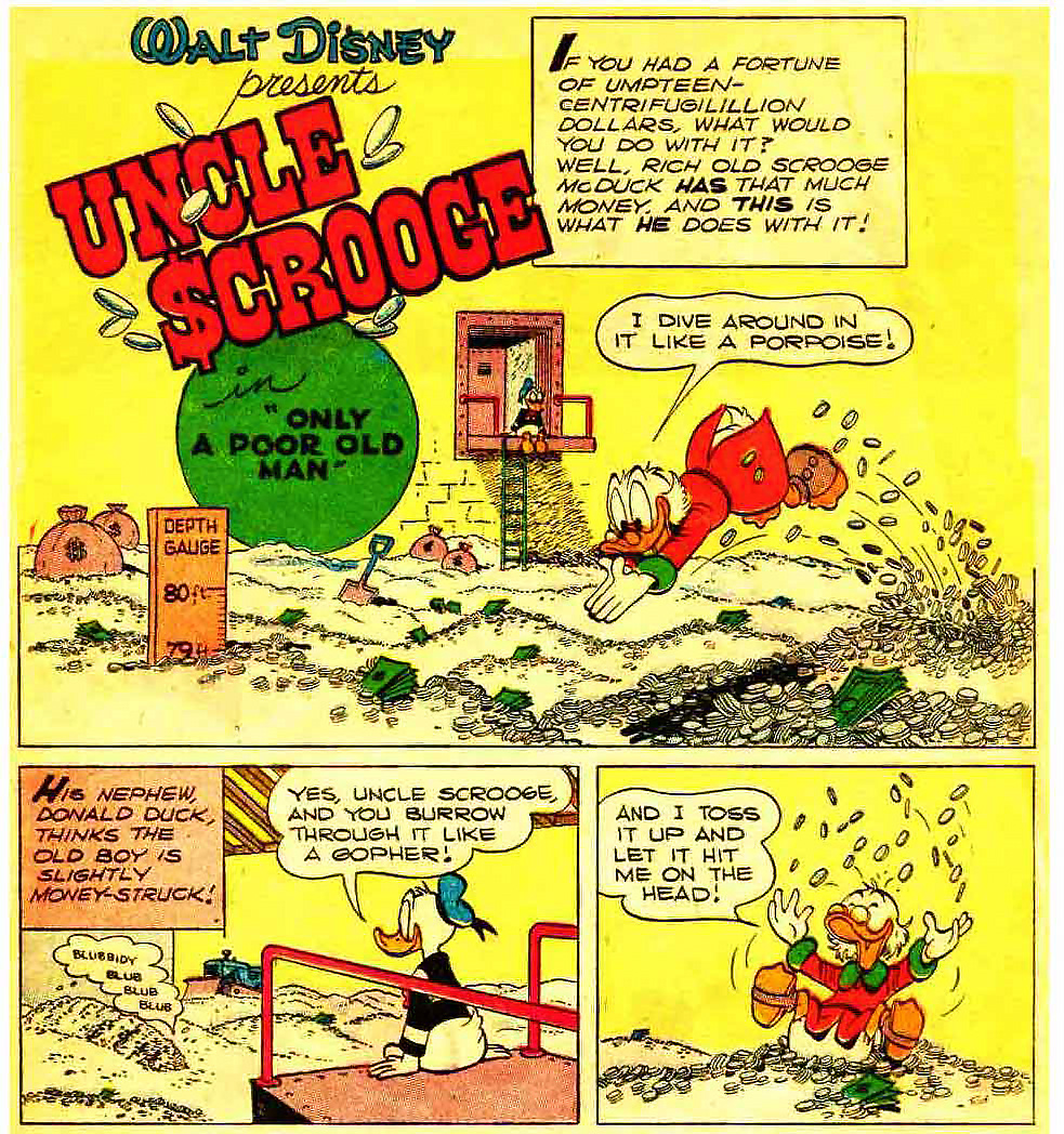 Joachim Kalka’s 2009 New Left Review article on the waning presence of tangible coinage in credit card capitalism is a delightful read. Kalka enlists Scrooge McDuck to illustrate a monetary carnality opposed to the fluid meaninglessness of the exchange principle. In Scrooge’s Duckburg vault, money isn’t just something you get to get something else (and that “something else,” once given a monetary value, is itself imperiled by this reduction to mere abstract quantity). For Scrooge, money feels deliciously good and offers an exhilirating physical encounter in which he revels. In his direct encounter with his money Scrooge finds life.
