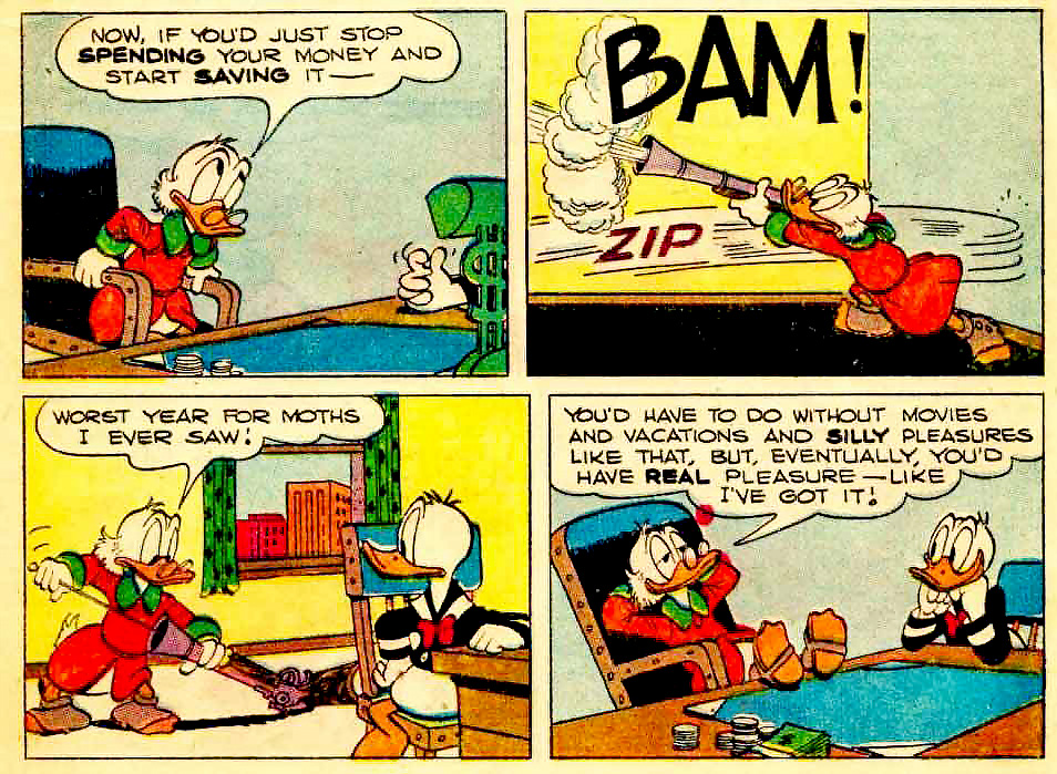 There are more ways of navigating the envy of others. Already in the first issue Scrooge advises his nephew that he should emulate Scrooge himself to solve his financial problems. It is not just that Donald should save more, but that he should join Scrooge in his perverse devaluation of “silly pleasures”: